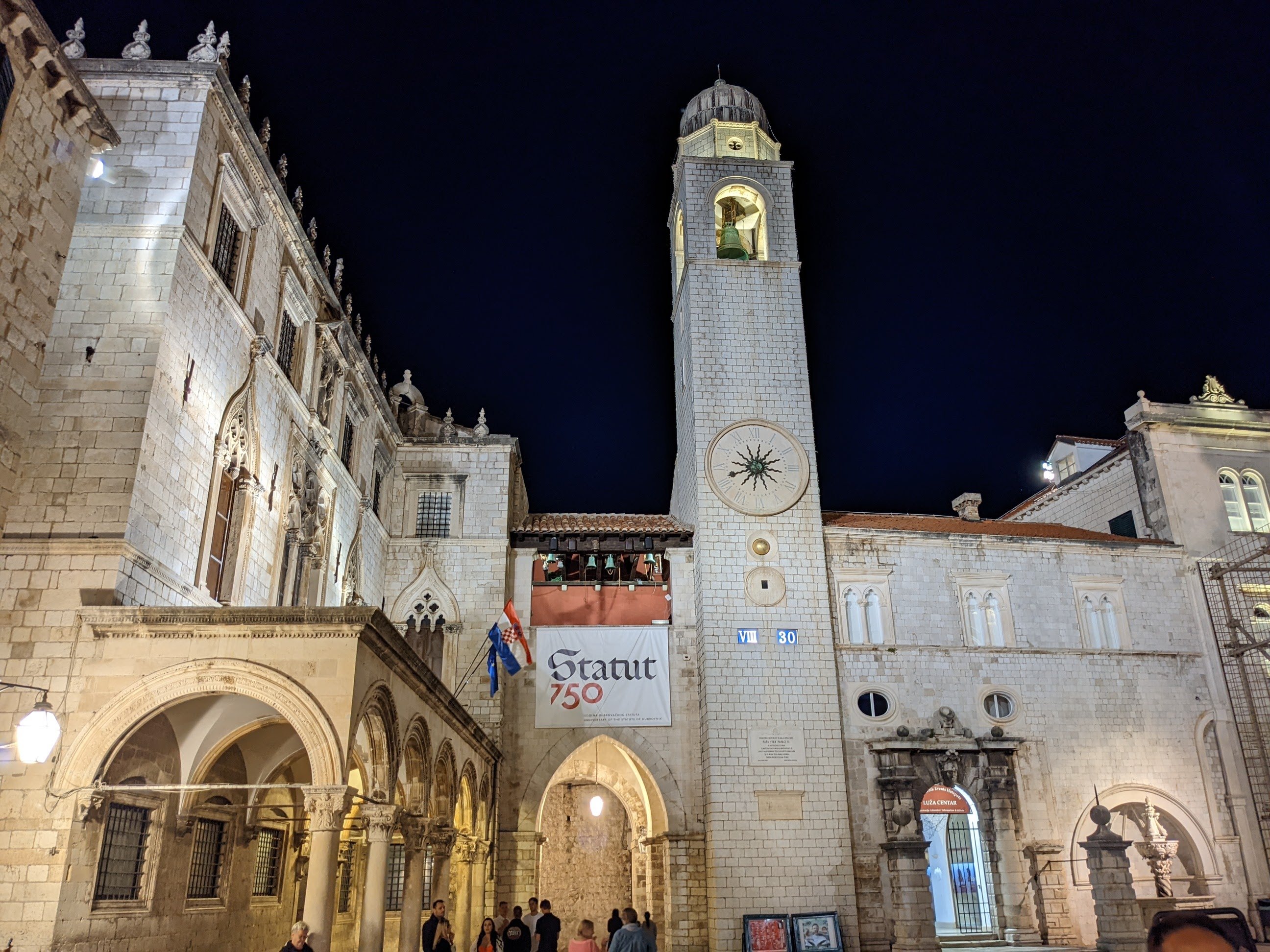 Ma préférée est la place Luža, (place de la loge) sur laquelle se trouvent tellement de beaux édifices qu’on ne sait plus où regarder : l’Église St Blaise (le Saint patron de Dubrovnik), l’hôtel de ville, la tour de l’horloge, le palais du Recteur, le palais Sponza et la cathédrale.