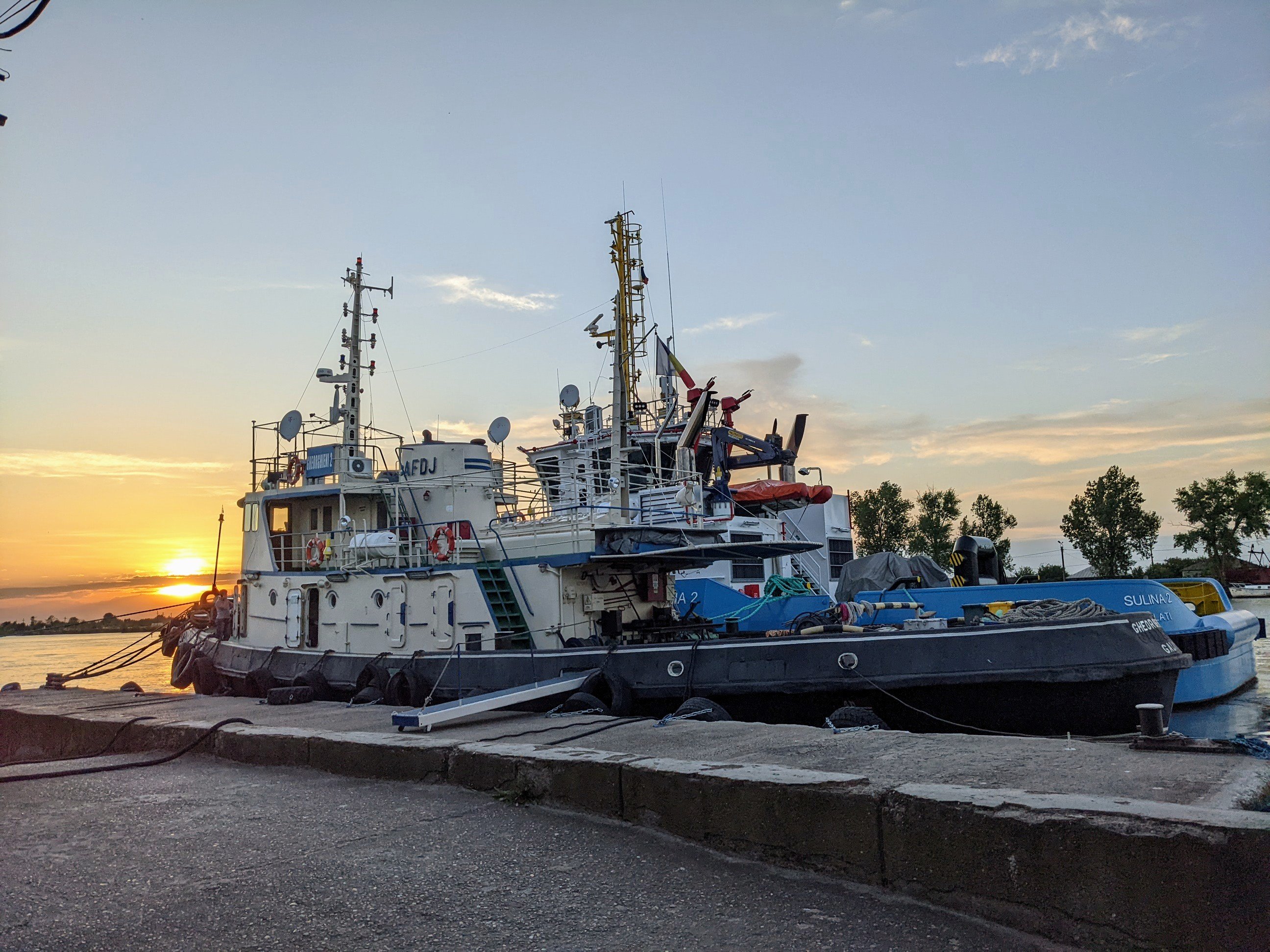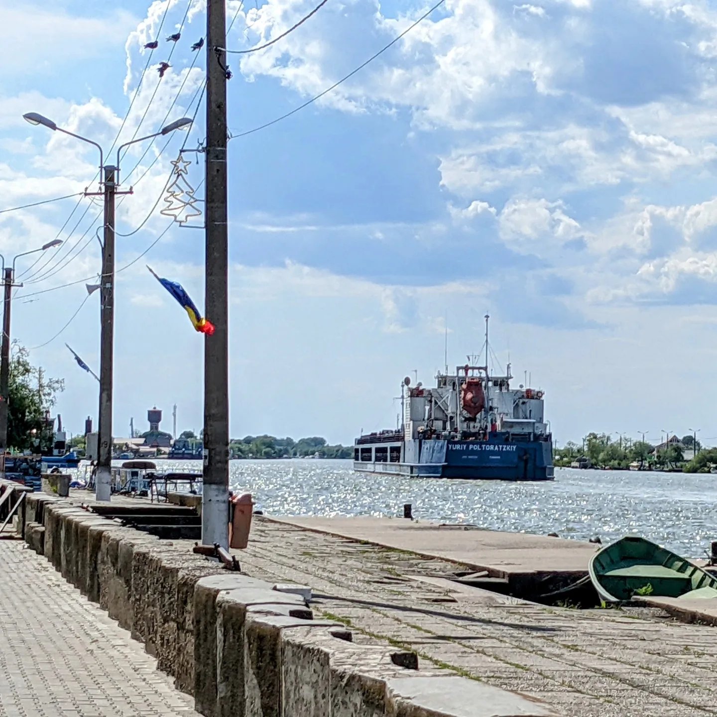 Nous sommes arrivés à Tulcea. La ville n’est pas vraiment belle: chantiers navals, chantiers tout court et immeubles en béton plutôt délabrés. Les quais sont inaccessibles, même les musées sont fermés et nous n’avons rien trouvé à y faire. Nous sommes logés au 7e étage d’un immeuble en travaux, ce qui nous permet tout de même d’avoir une belle vue sur le Danube et de nous maintenir en forme en grimpant tous les étages. Et puis de toutes façons, on ne va pas s’éterniser ici puisqu’on a rendez-vous de bon matin avec Victor et les oiseaux du Delta !