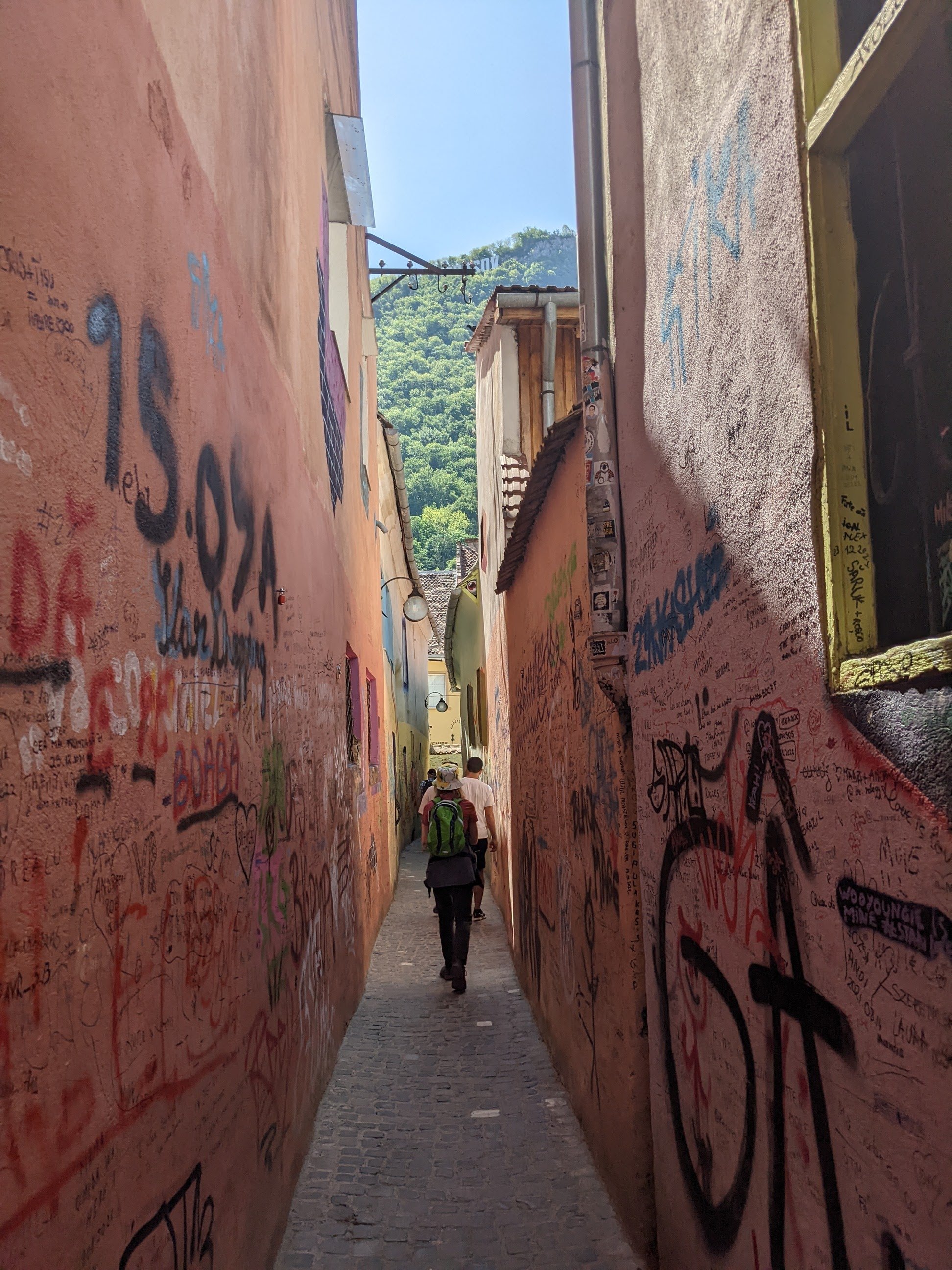 La ville était autrefois divisée en 3 villages: le quartier hongrois, le quartier allemand et le quartier roumain qui se trouvait à l’extérieur des fortifications. En flânant dans la vieille ville, on peut y voir l’église noire (dont la construction a duré 100 ans et qui a été nommée ainsi suite à un incendie qui a noirci les pierres) et l’église Saint Nicolas. Il y a dans ces deux édifices religieux d’importantes collections de tapis ottomans, en raison de la situation géographique de Brasov, carrefour commercial entre Istanbul et Budapest. On peut se faufiler dans la rue ficelle (strada Sforii), qui serait la ruelle la plus étroite d’Europe. C’est amusant de la traverser en touchant les murs de chaque côté.