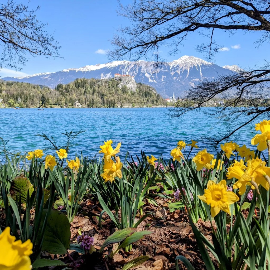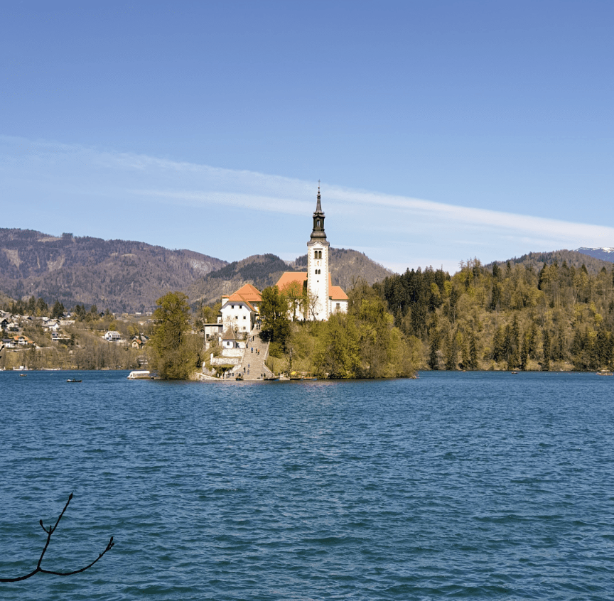 Le lac est entouré de montagnes aux sommets enneigés et surplombé par un château médiéval. Au milieu du lac, un petit îlot (ce serait l’unique île de Slovénie !) sur lequel se trouve l’église Sainte Marie.