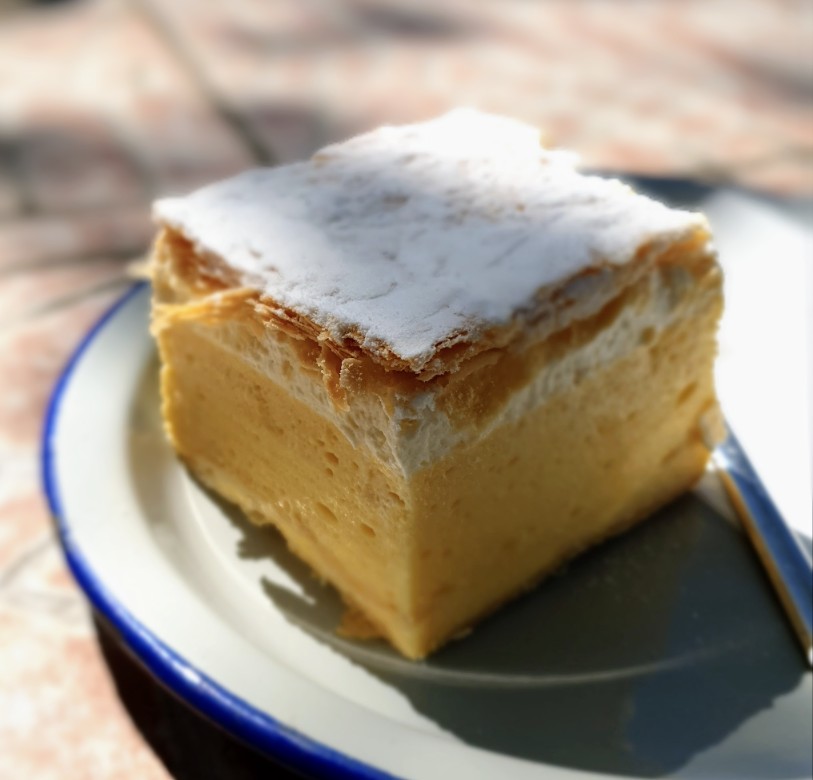 Avant de repartir, nous avons goûté à la spécialité de Bled dans un petit café : la kremšnita – ou « tranche de crème ». C’est bon, mais copieux ! … il faudrait refaire un tour du lac pour l’éliminer … 😋